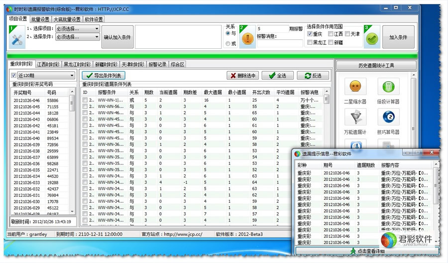君彩11选5遗漏报警软件,是网络上最知名最权威的时时彩遗漏报警软件的兄弟版,专注于11选5彩票的遗漏报警功能!