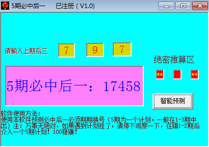 彩神吧论坛分享:软件名字叫5期必中后一,彩友们都知道是不可能的,分享出来也只是仅供参考娱乐下,有兴趣的下载验证下!