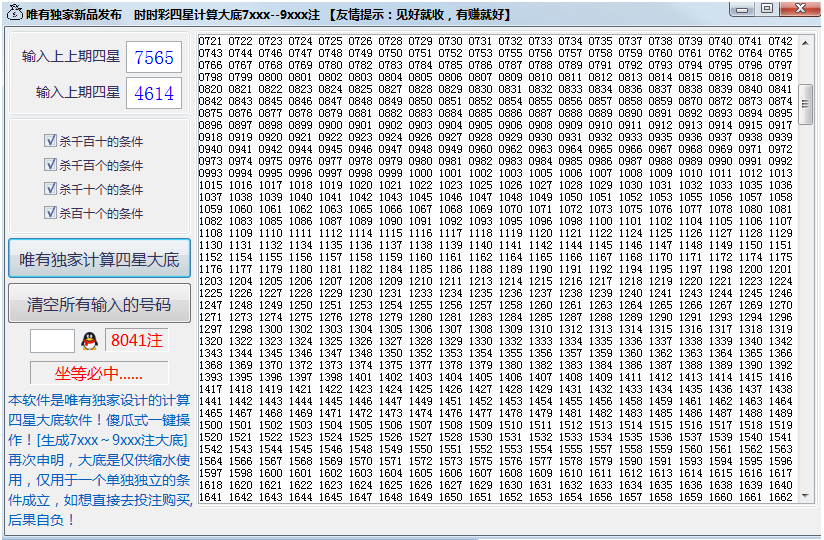 鸿运四星稳定大底收费版,这里给会员们分享的是免费版,时时彩四星大底,支持前四后四,喜欢玩四星的可以下载来用用,可以用来和其他大底缩水,减少投注注数,虽然是公式固定出大底,不过准确率还是不错的,会员们可以多多参考下!